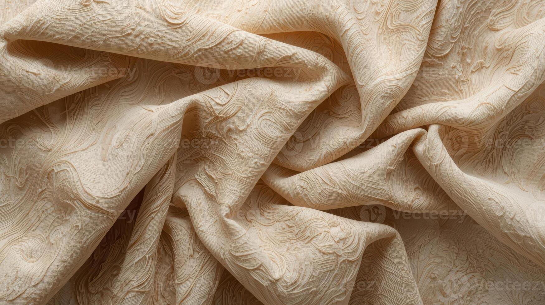 Elegant beige fabric with a subtle swirling pattern is artfully draped, creating soft folds and a luxurious texture perfect for background designs and textiles. Pro Photo
