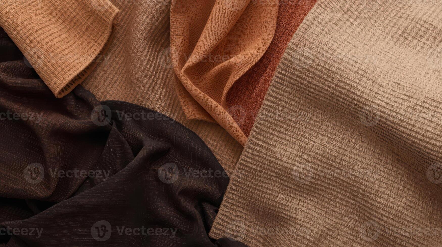 Various textured fabrics in warm earthy tones are draped and layered, creating an inviting, tactile surface perfect for backgrounds or textile design mockups. Pro Photo