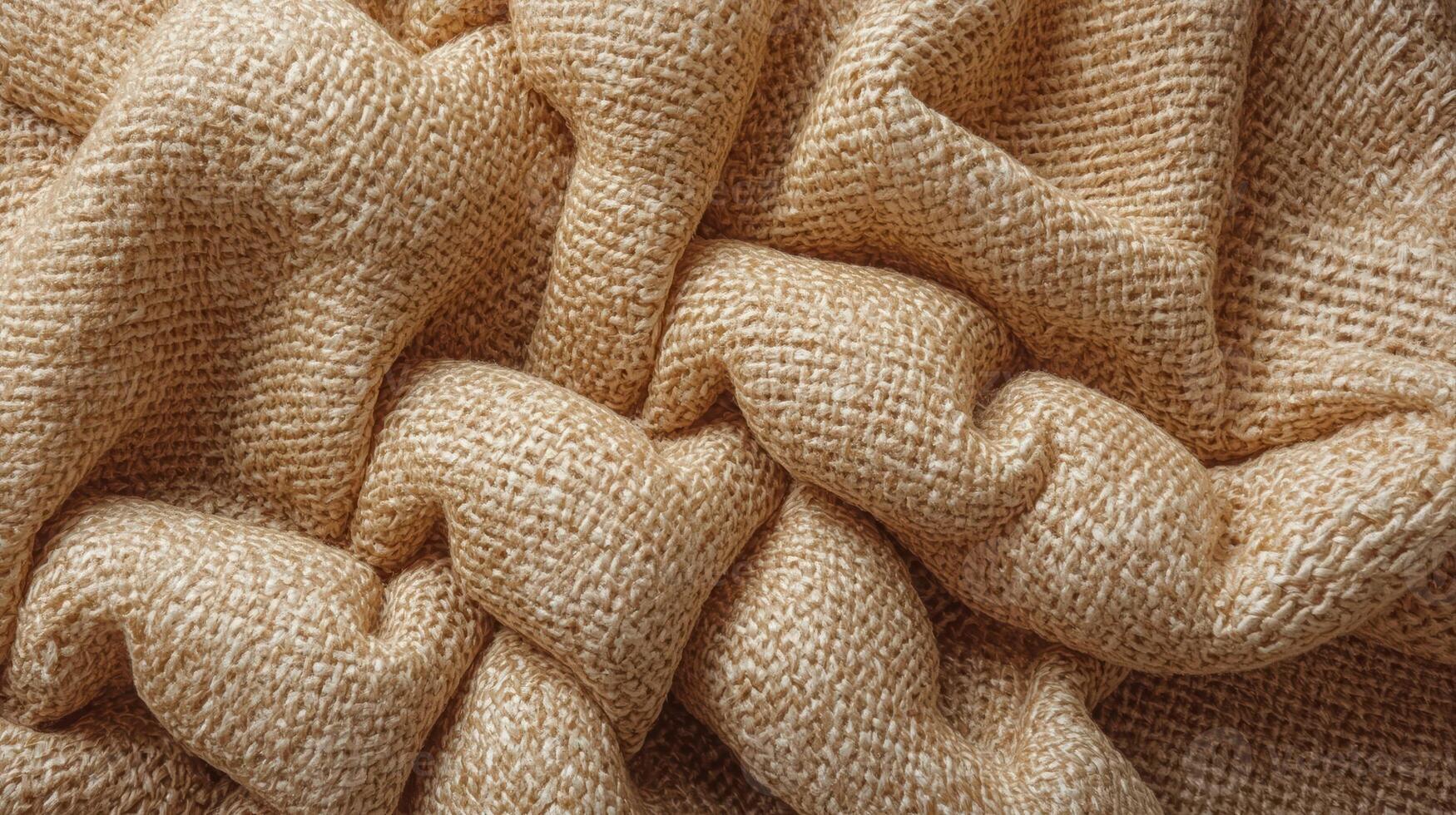 The detailed close up reveals the rustic texture of a natural burlap sack fabric, its folds and creases creating a visually appealing and organic background element. Pro Photo