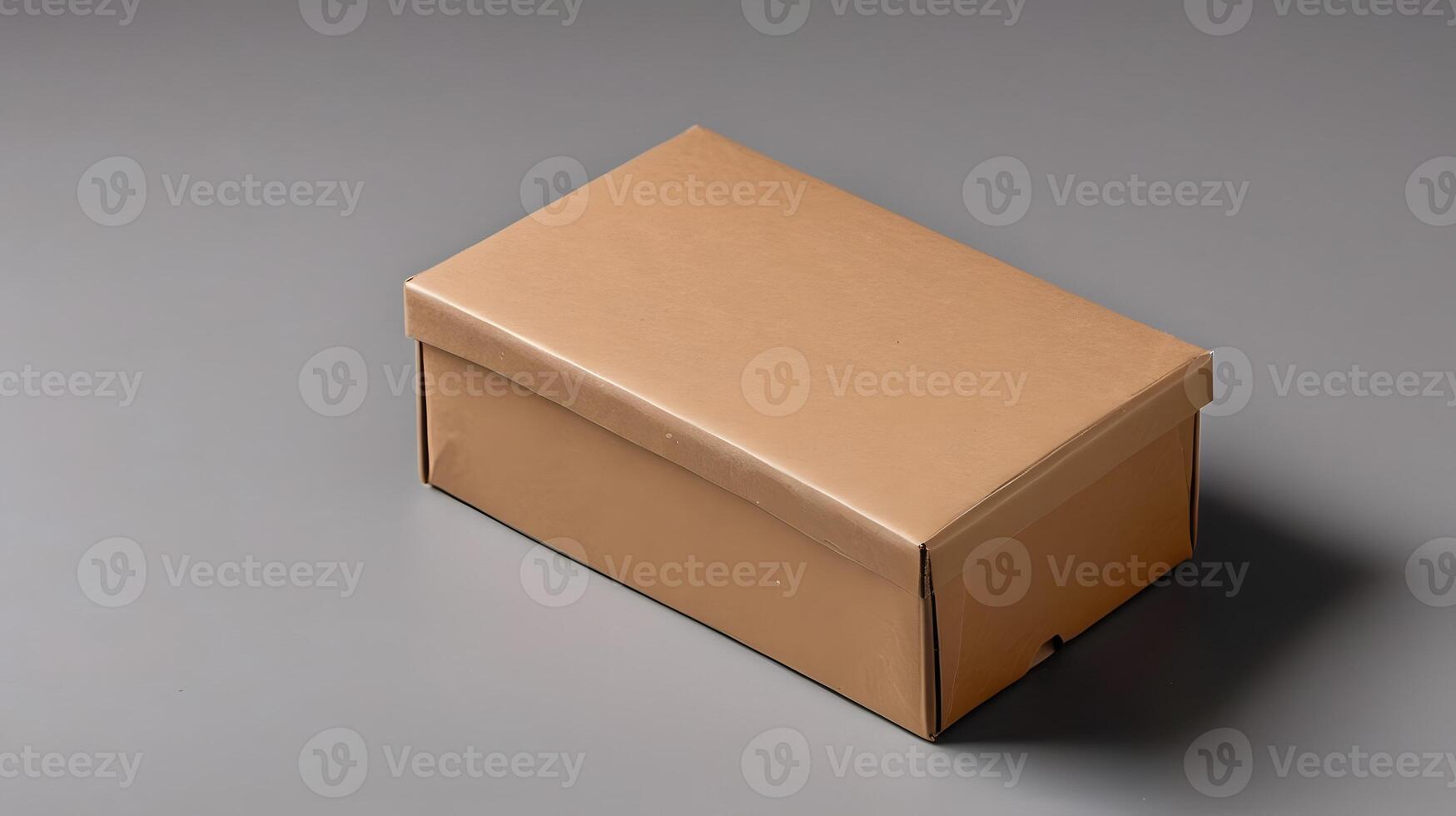 A simple brown cardboard box sits closed on a gray surface casting a soft shadow in the studio setting. Pro Photo