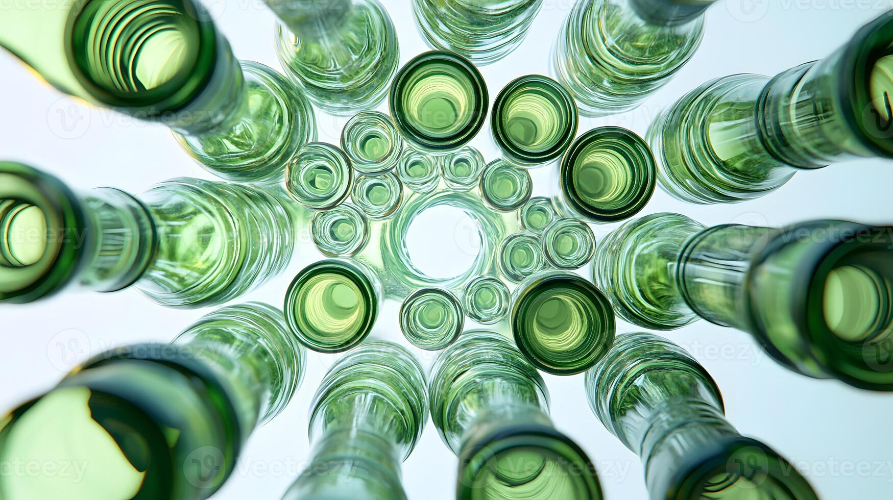 An abstract perspective shows multiple empty green glass bottles arranged in a circular pattern on white table. Pro Photo