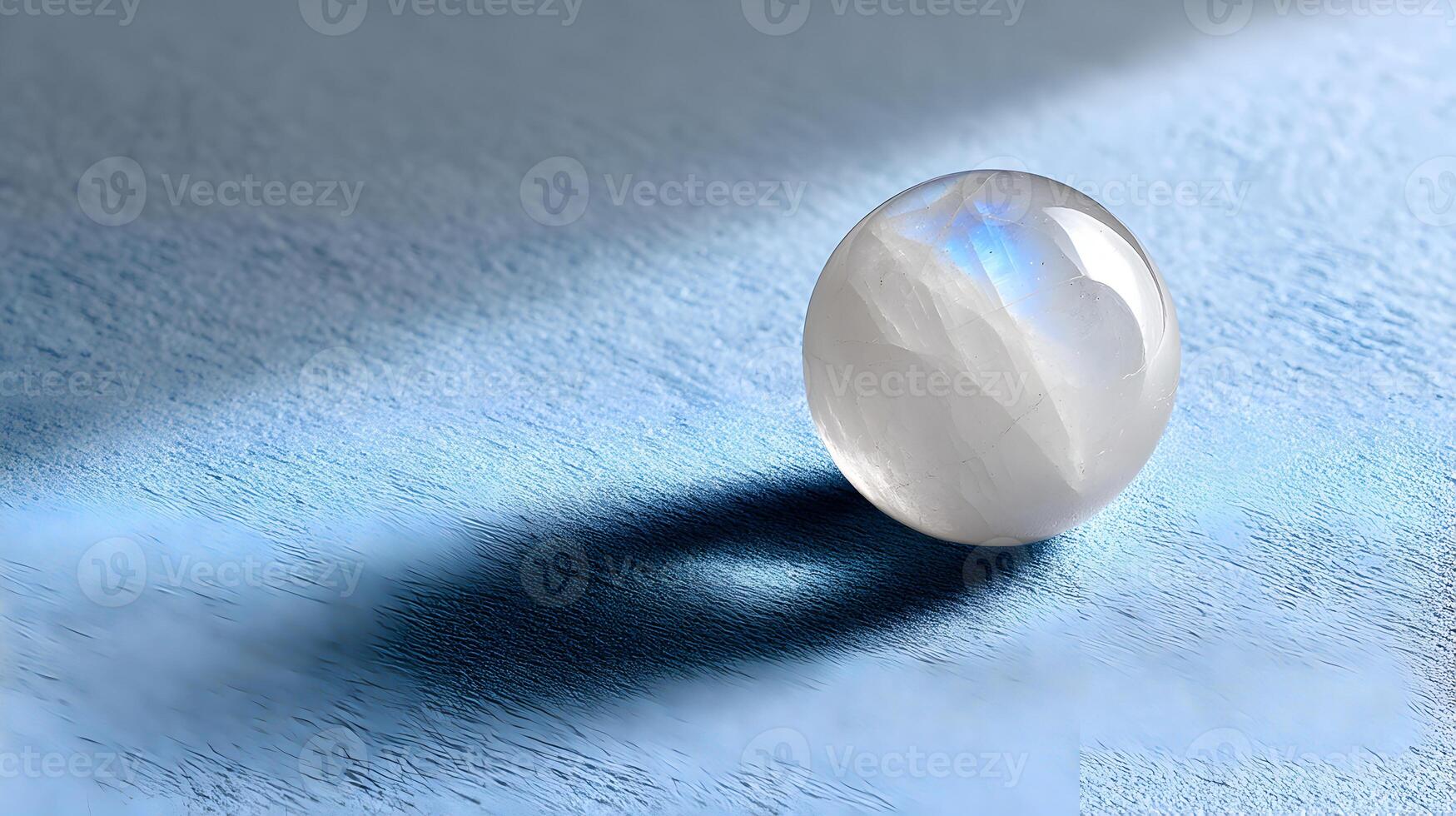 Polished moonstone sphere resting on textured blue surface, soft lighting highlighting stone's luminescent qualities and creating subtle, ethereal shadow pattern Pro Photo
