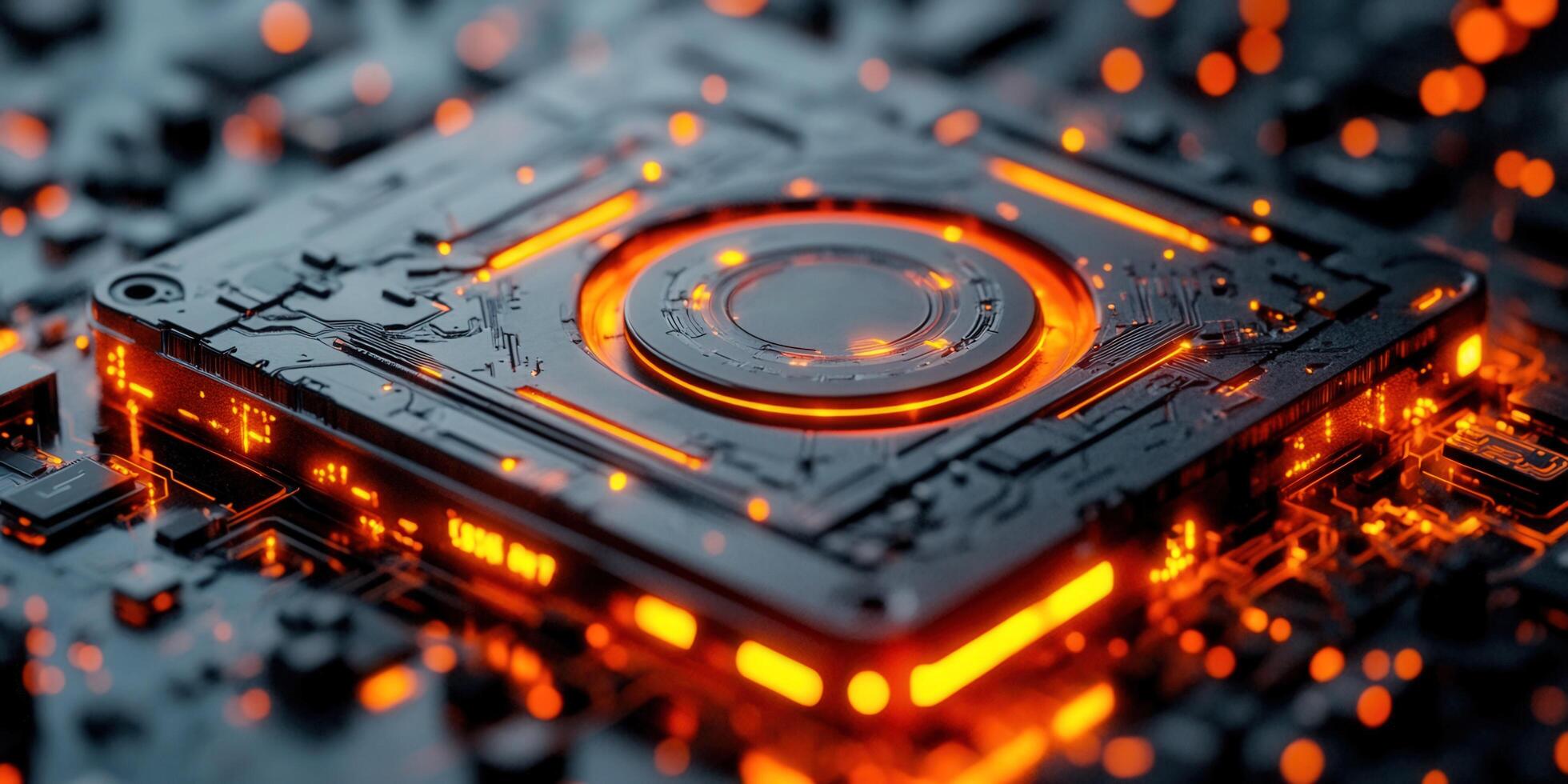 Intricate circuit board illuminated by glowing orange and yellow lights, a symbol of advanced technology. photo
