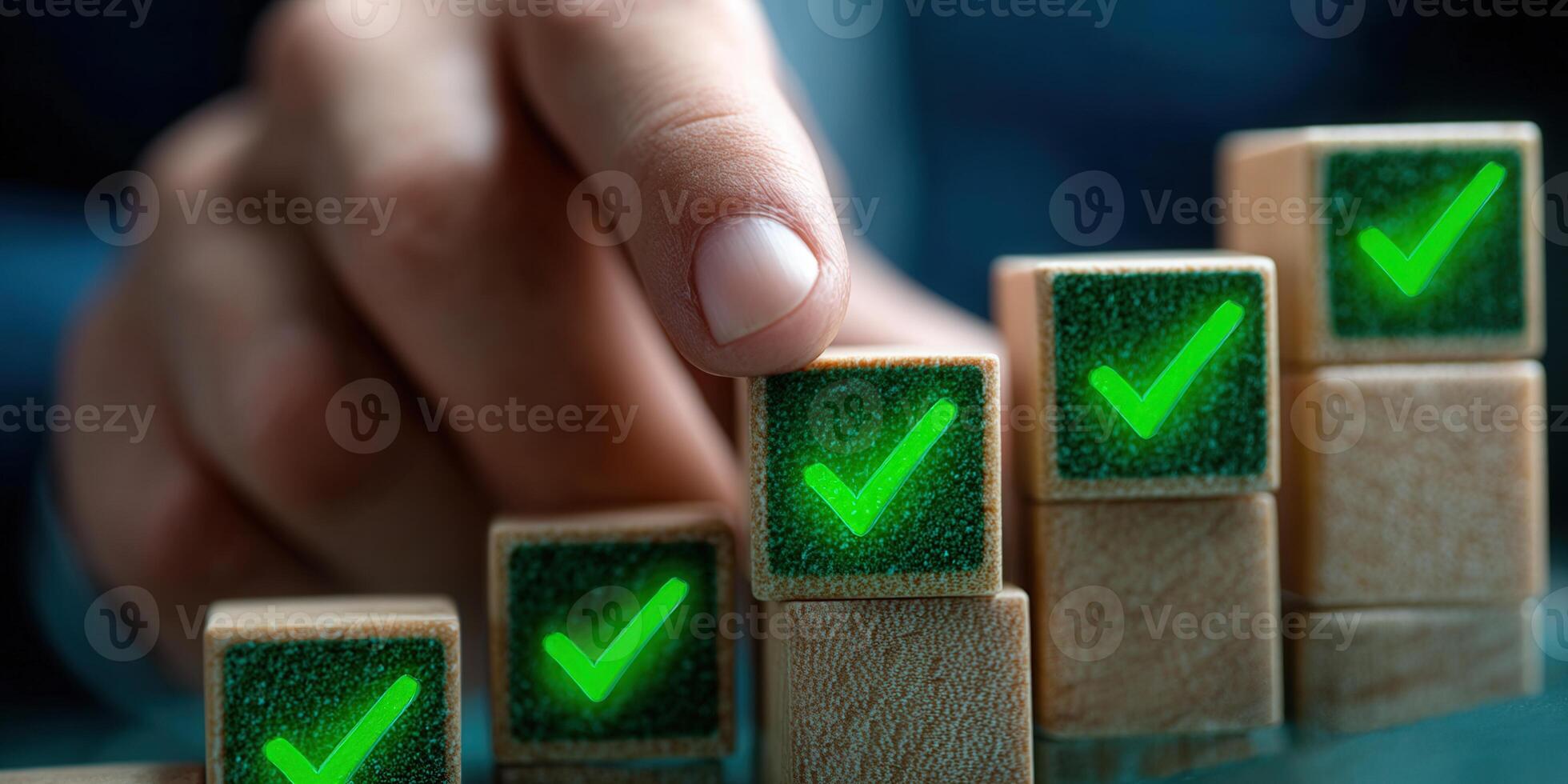 A hand completing a stack of blocks, each with a green checkmark, symbolizing success and achievement. Pro Photo