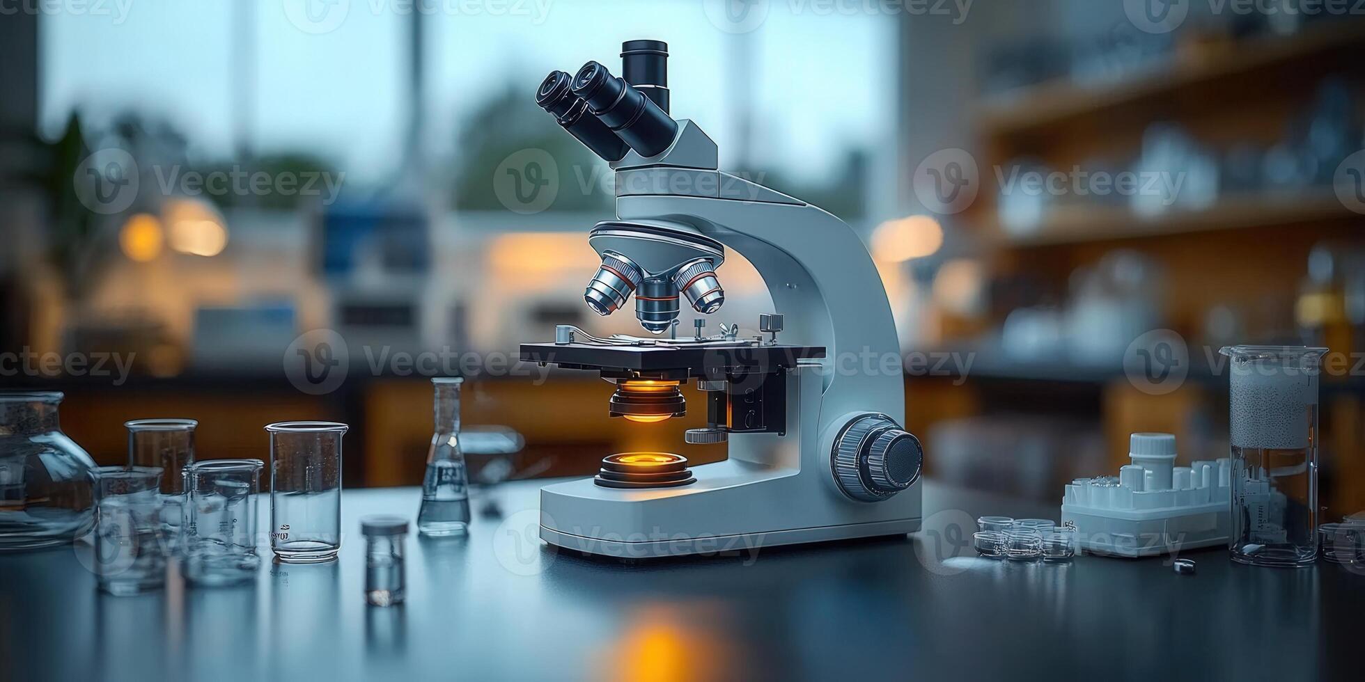 Microscope in a lab with research and analysis tools on the table. Pro Photo