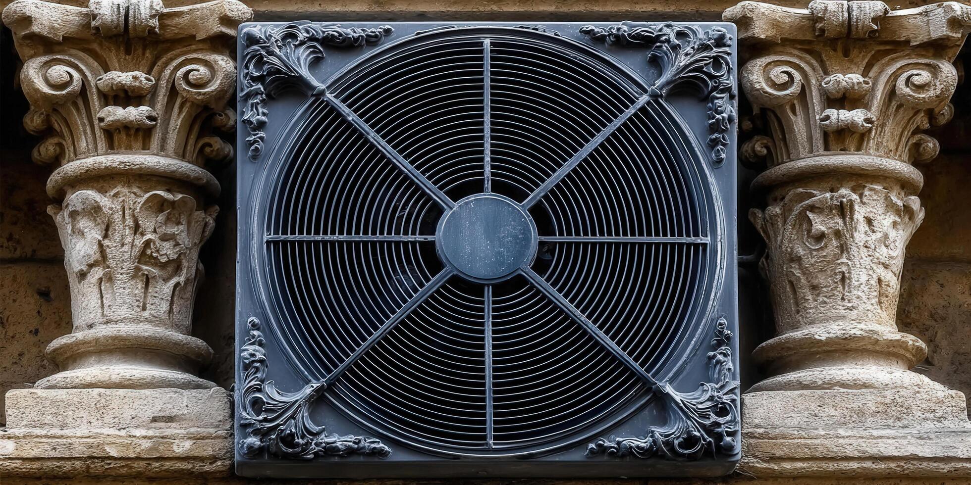 Intricate architectural composition of a circular vent and stone columns. Free Photo