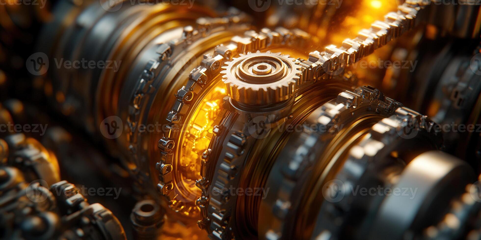 Intricate mechanical gears and chains are illuminated by a warm, golden glow, highlighting complex details. Pro Photo