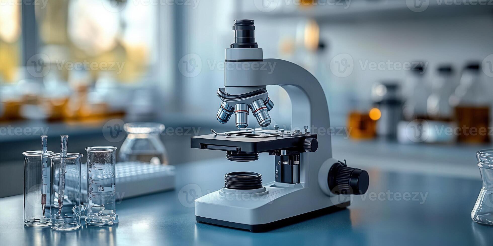 A detailed image of a microscope in a science lab, with beakers and test tubes. Pro Photo