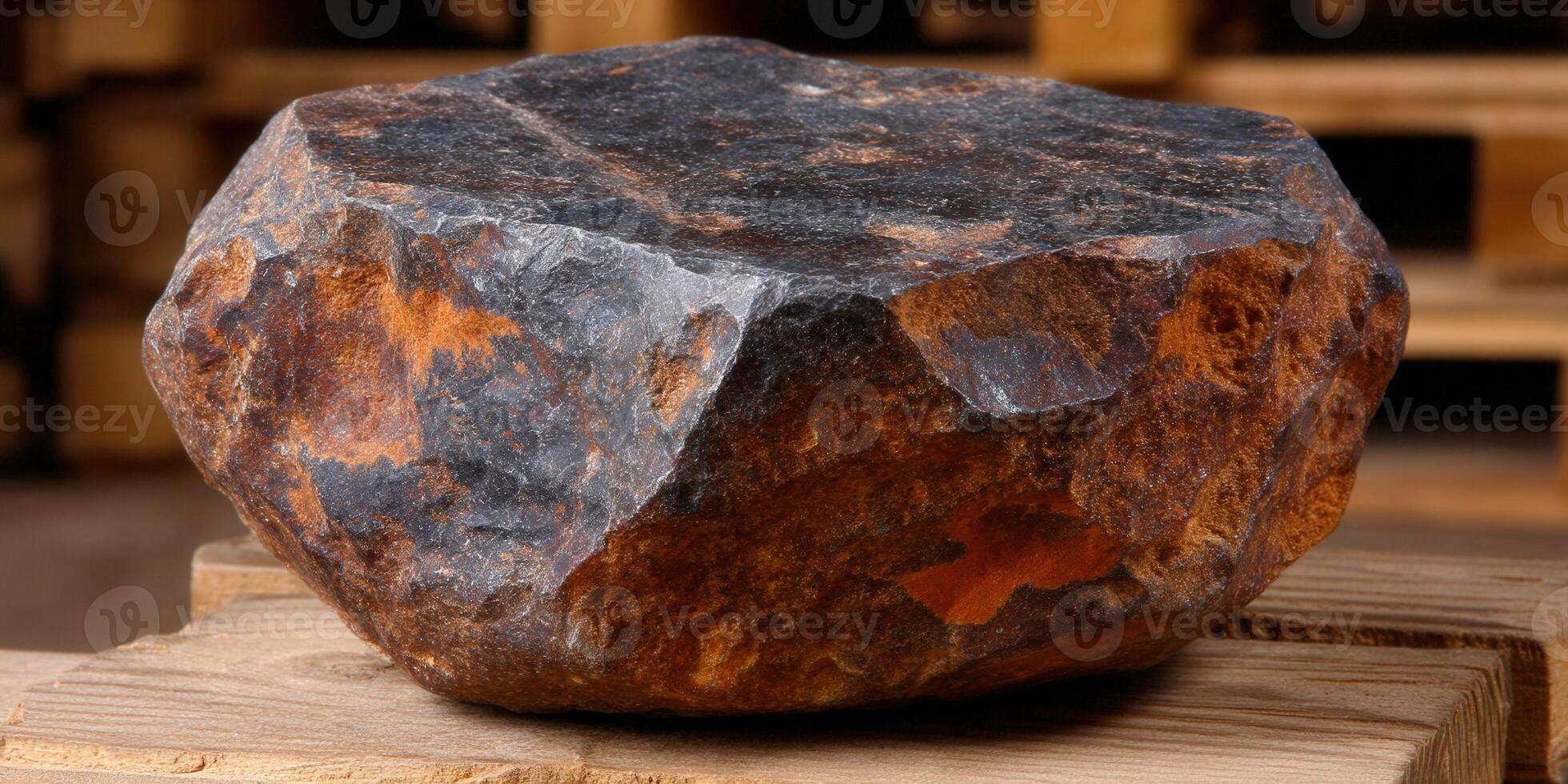 A striking view of a textured rock with a blend of colors resting on wood. Pro Photo
