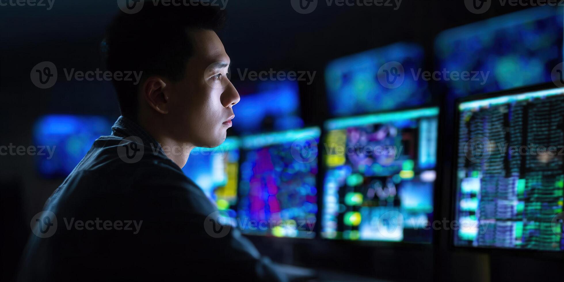 A focused Asian man monitors computer screens, possibly in a tech or security environment, with data displayed. Pro Photo