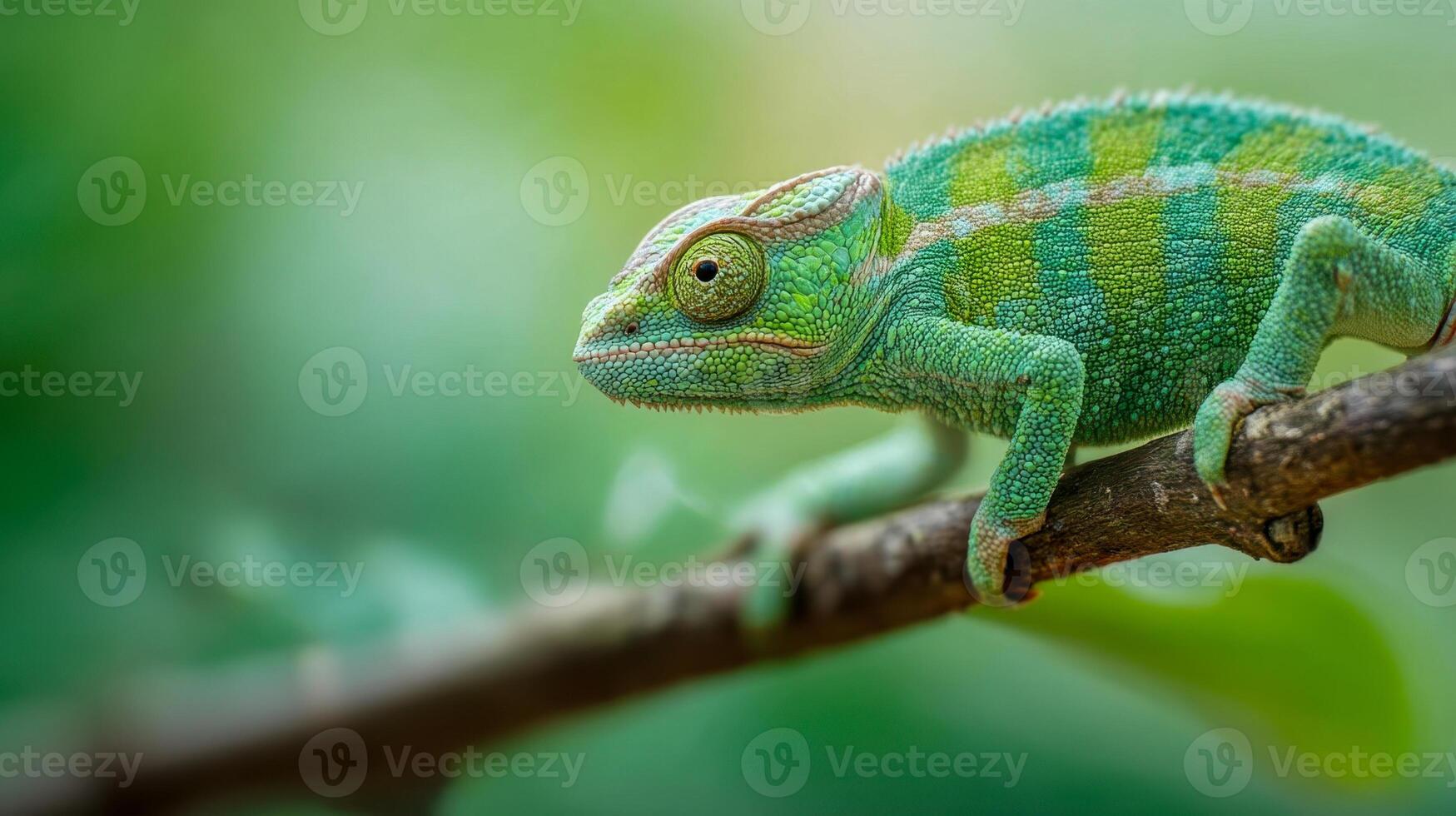 Green chameleon resting on a tree branch, side view of the reptile with striped scales in its natural forest habitat Pro Photo