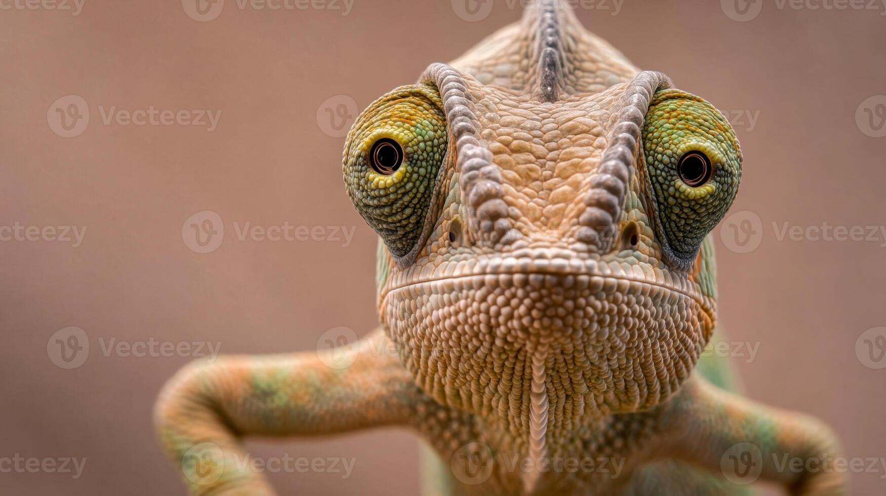 Macro close-up of a chameleon staring at the camera, an exotic reptile with textured scales and a curious expression Pro Photo