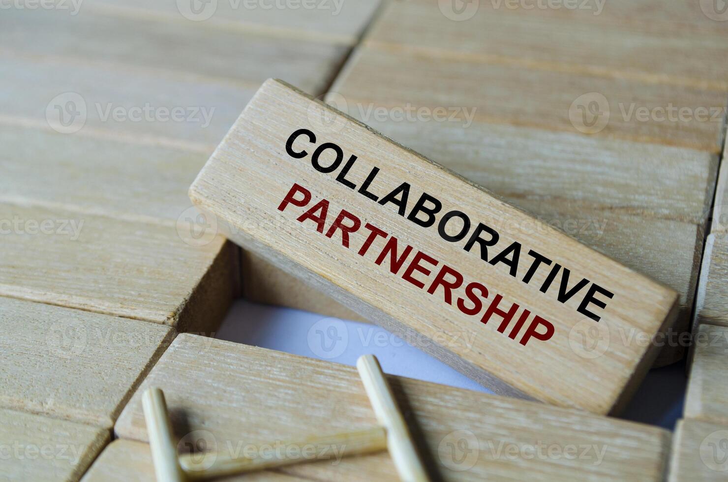 Collaborative Partnership text written on wooden blocks arranged on a ladder emphasizing teamwork and shared effort. Pro Photo