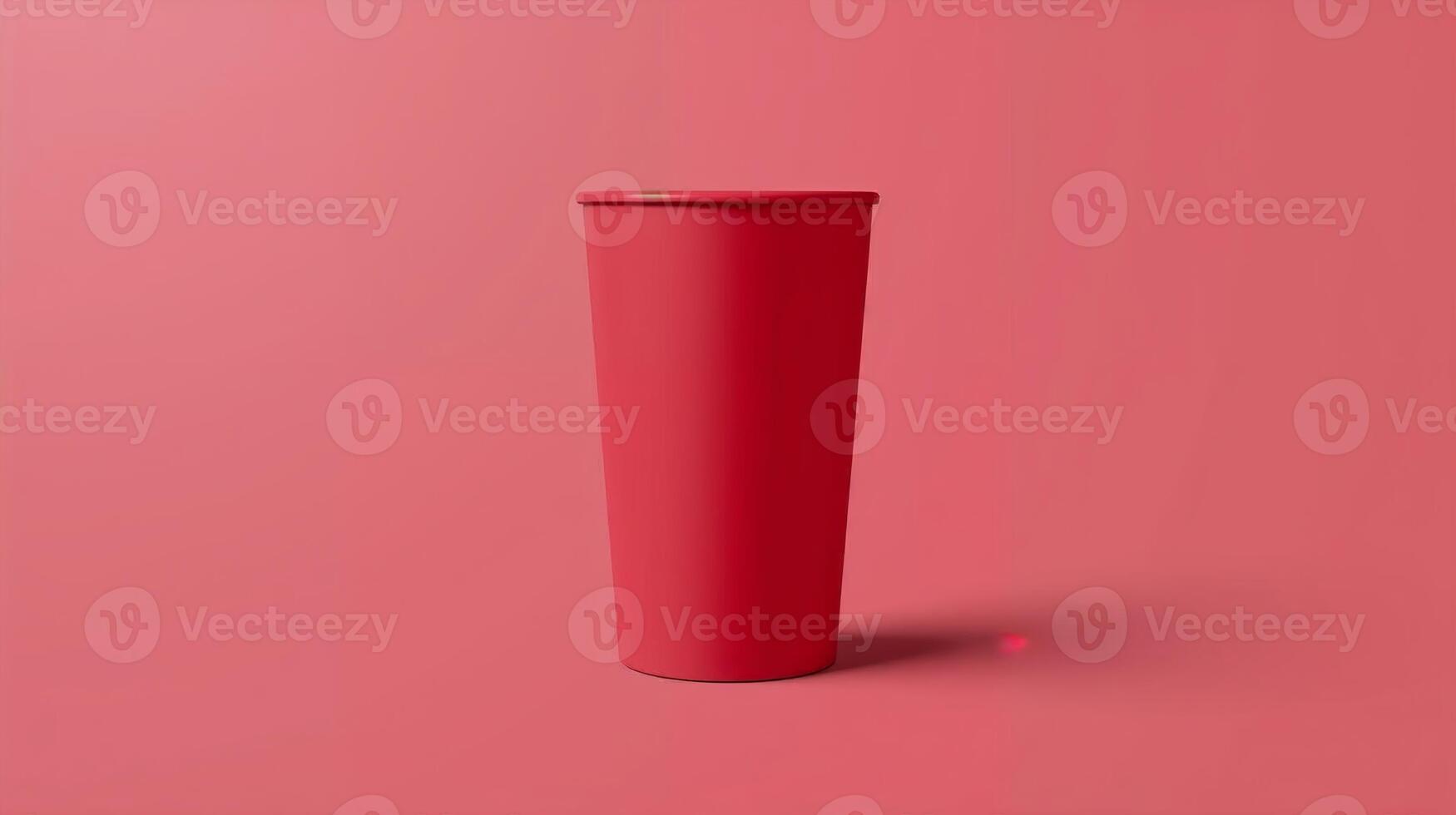 A tall, matte red cup with a matching lid stands on a solid red surface, creating a monochromatic and minimalist composition. Pro Photo