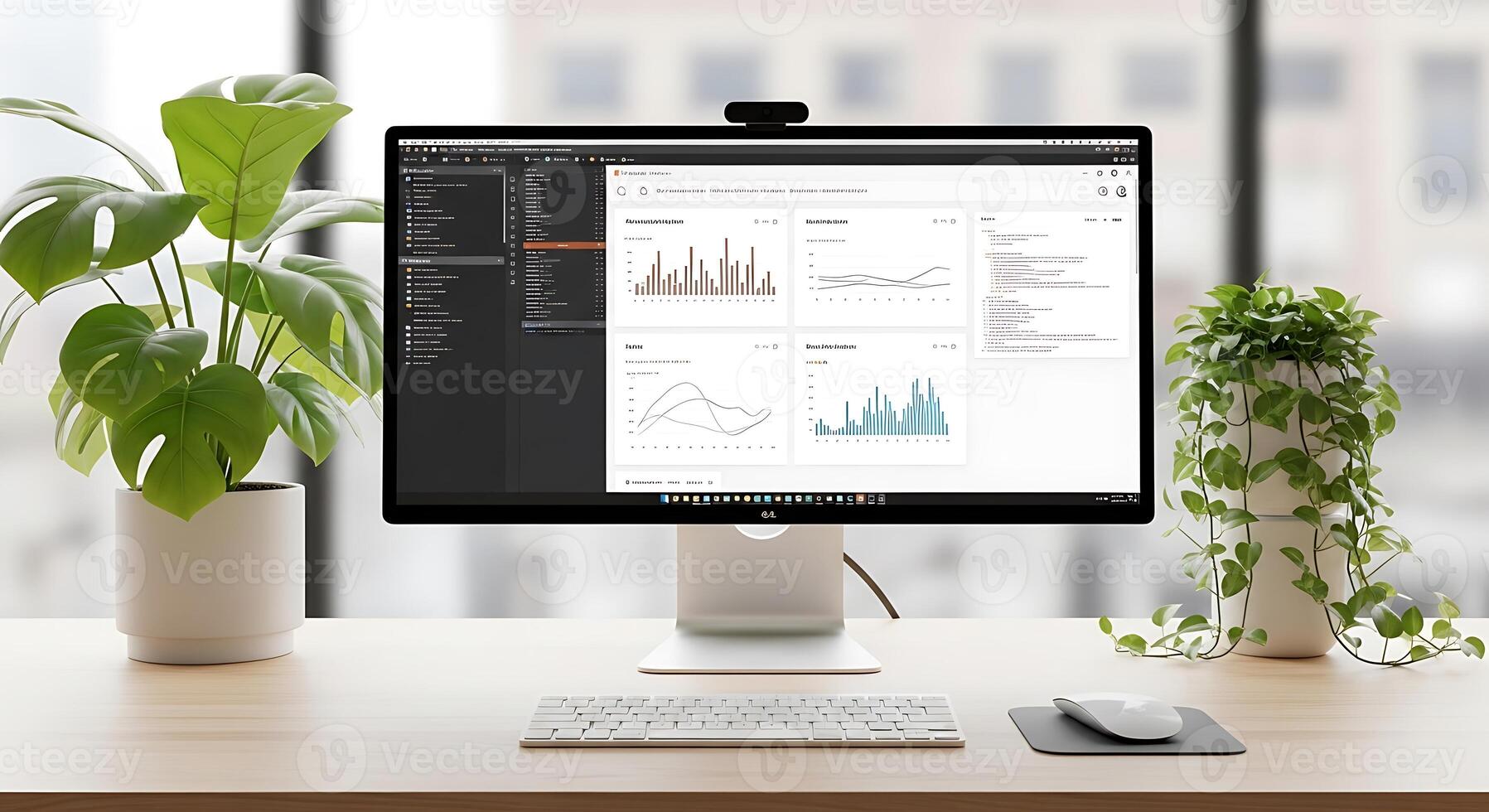 Modern workspace with a computer displaying data visualizations and plants in a bright office Pro Photo