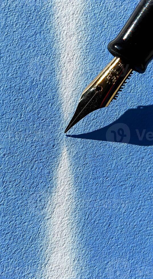 A close-up view of a fountain pen nib positioned on a textured, vibrant blue surface, illuminated by a light source casting a subtle shadow. Pro Photo