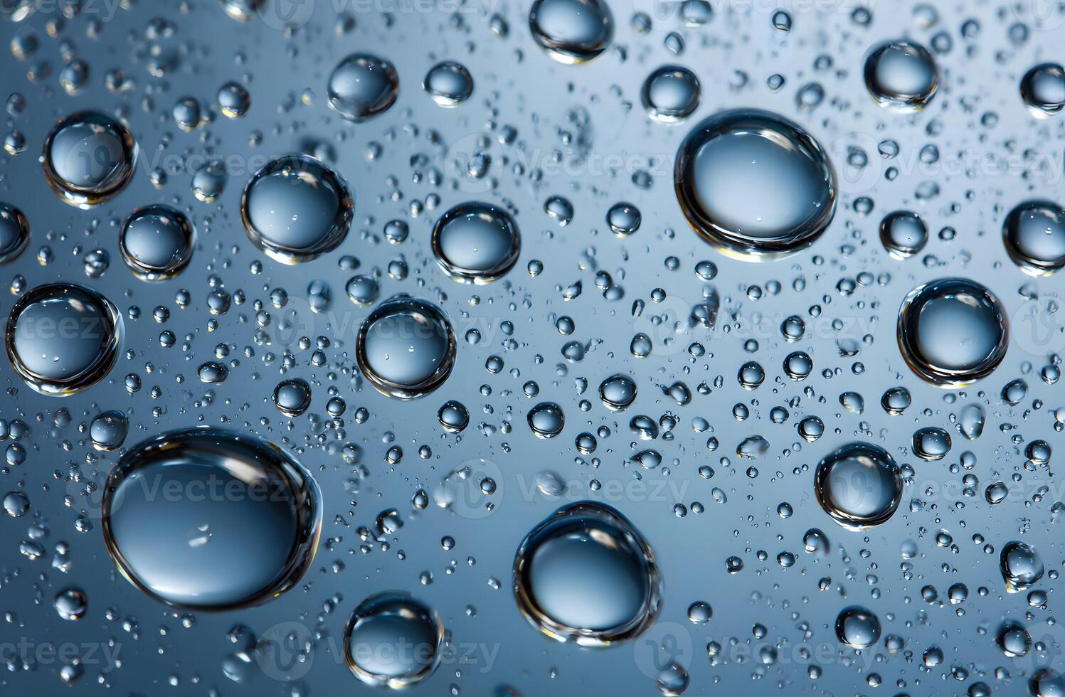Close-up view of numerous water droplets on a surface, exhibiting a variety of sizes and shapes, creating a mesmerizing visual effect with reflective surfaces and subtle gradations of blue tones. Pro Photo