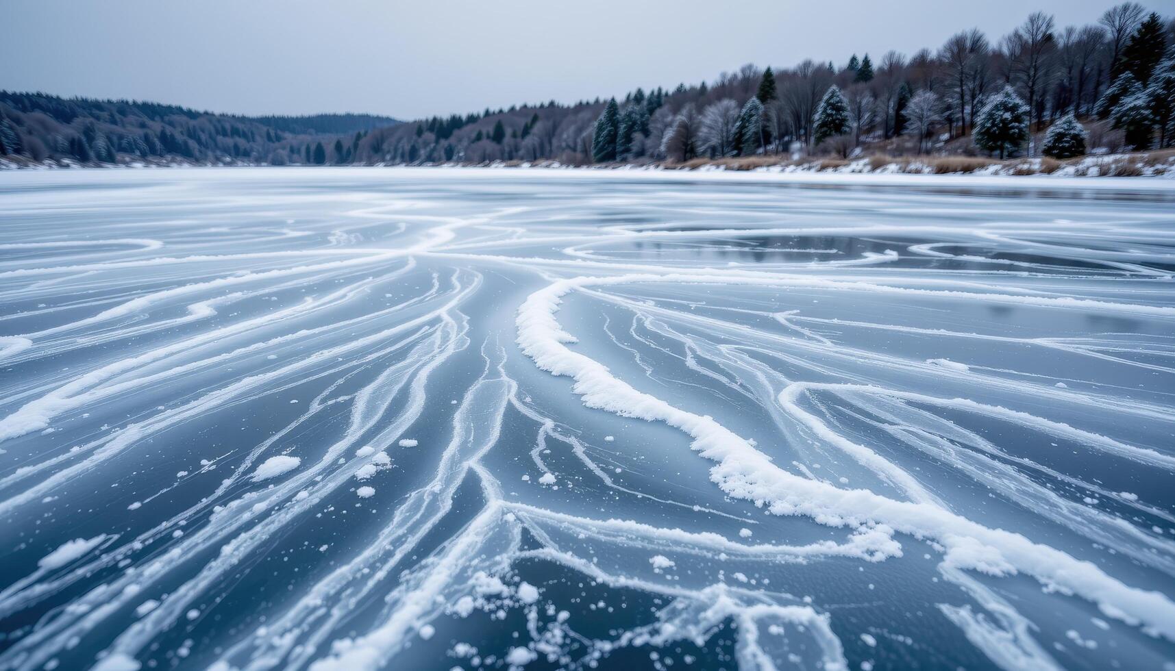 a frozen lake under winter sky, snow scattered lightly, creating delicate patterns across ice. photo