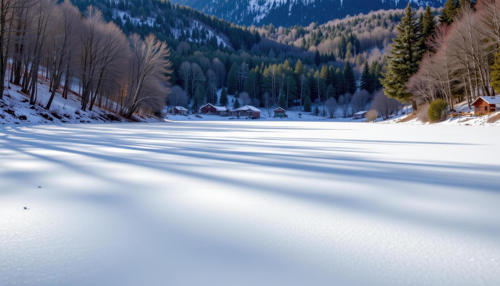 a wide lake frozen solid, snow covering every inch, sunlight creating soft reflective patterns across. Free Photo