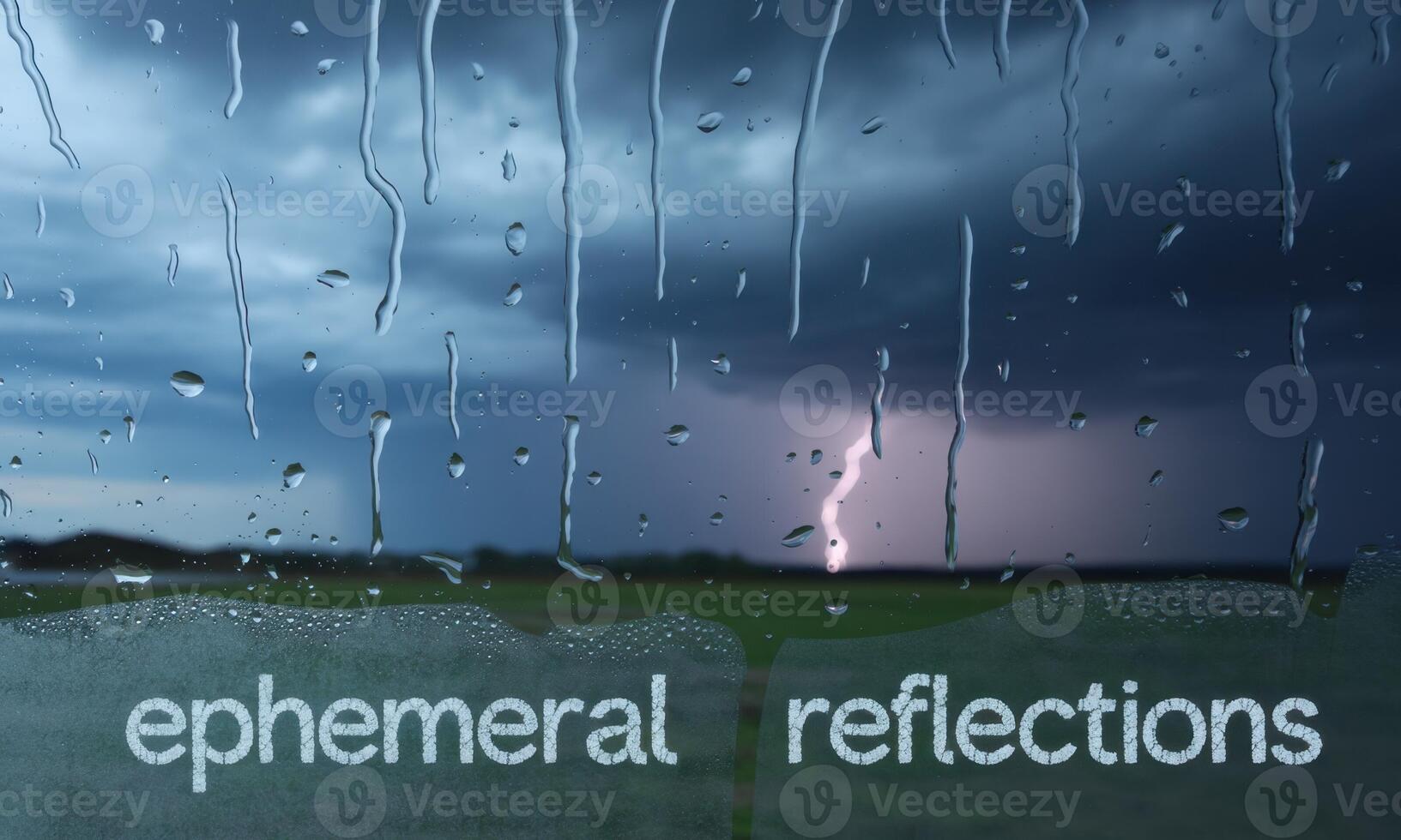 Raindrops on window pane with distorted view of stormy sky and lightning strike Pro Photo