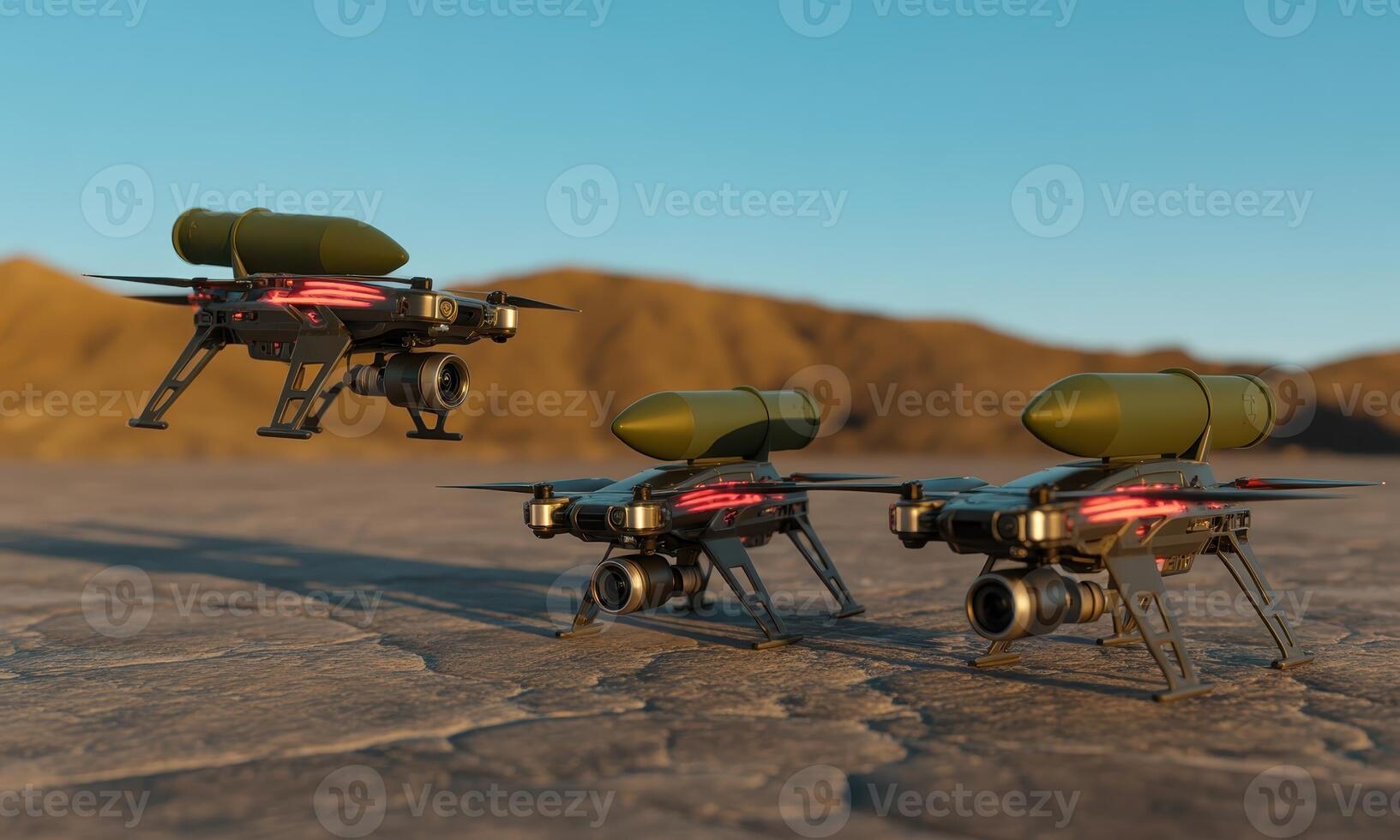 Advanced combat drones armed with missiles ready for action in a desert terrain Pro Photo