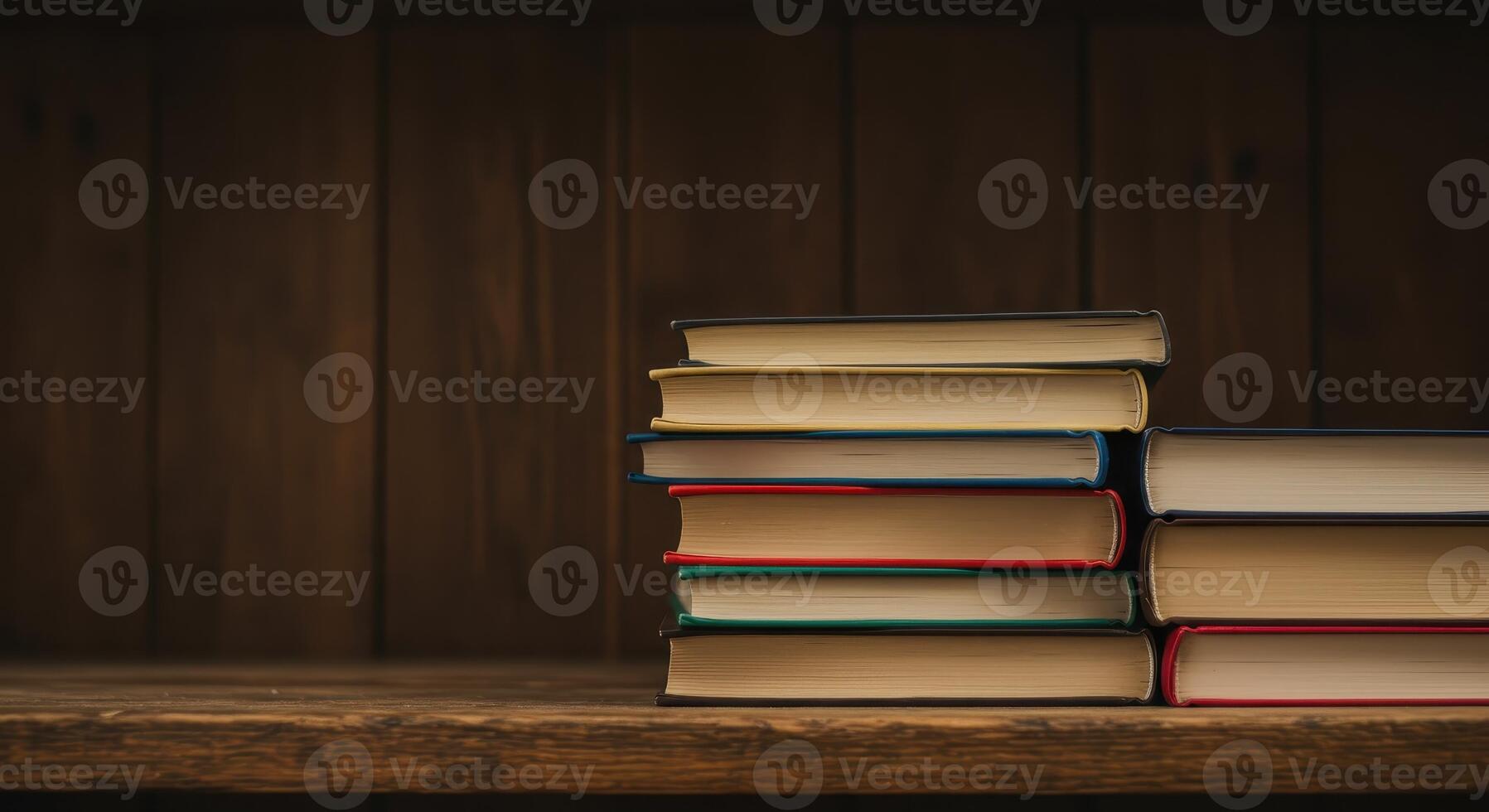 Stack of colorful books on a rustic wooden shelf with soft bokeh background Pro Photo