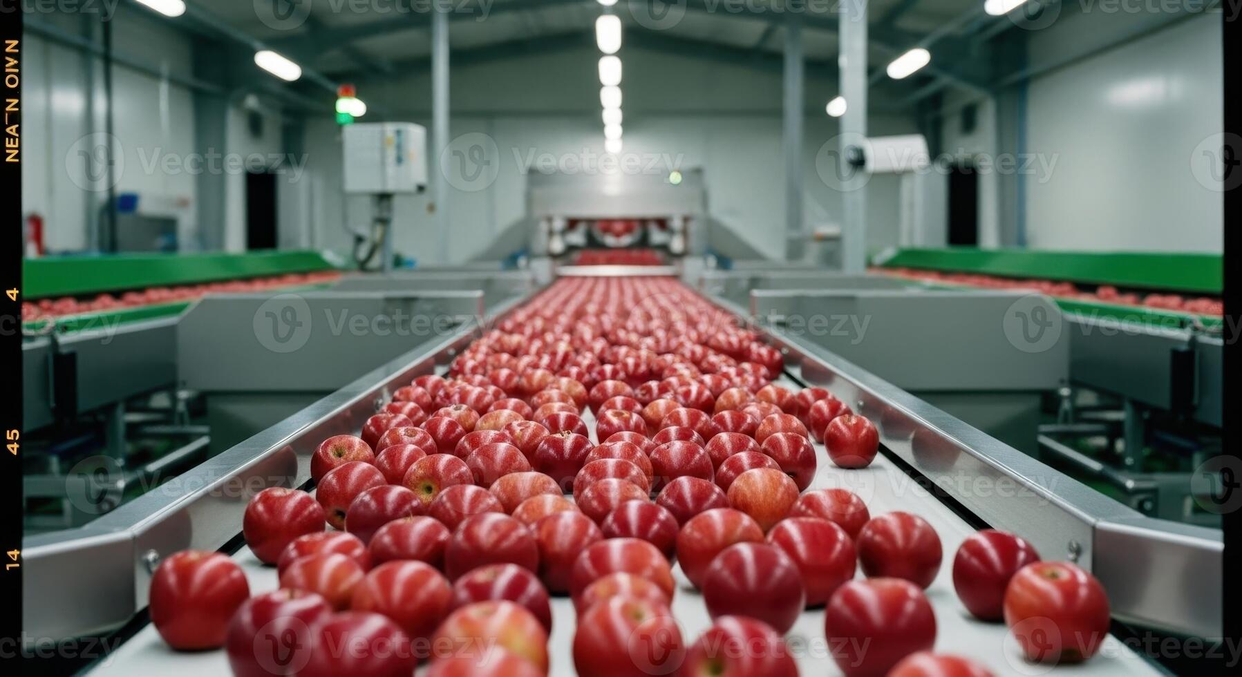 Vibrant red apples moving on an automated conveyor belt in a modern sorting facility Pro Photo