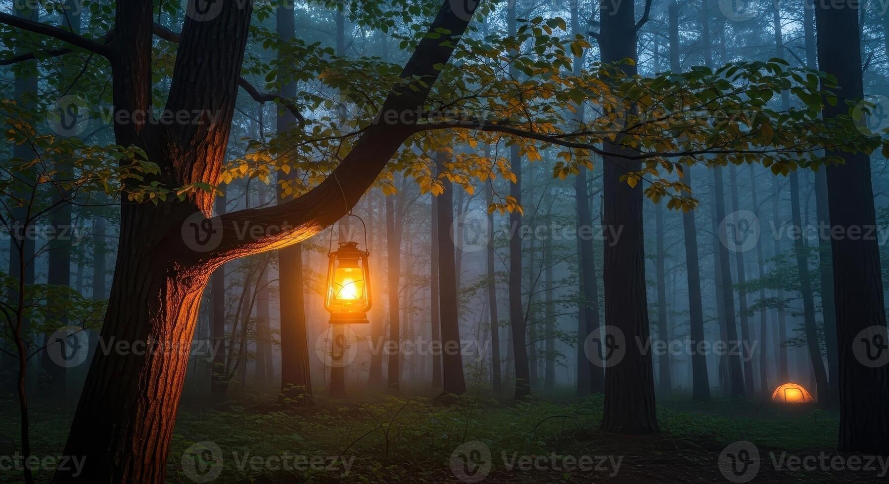 Illuminated lantern hanging from a tree branch in a dense, misty forest at dusk with a glowing tent Pro Photo