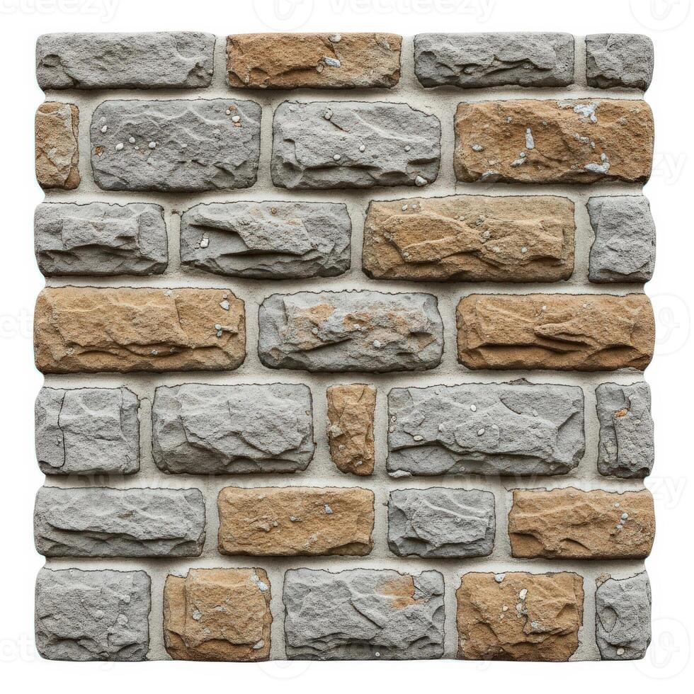 Rustic stone wall with varying shades of gray and brown isolated on white background, creating a textured pattern Pro Photo