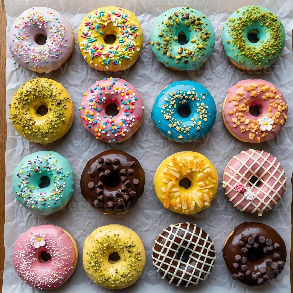 An array of colorful donuts with various toppings arranged on a parchment paper background top down view Pro Photo