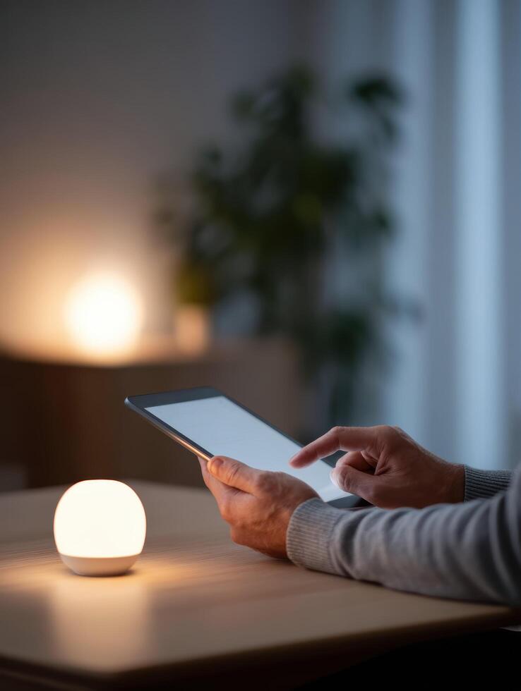 Focused person using tablet for smart home automation control at night. Wireless technology adjusts warm lamp, creating calm and modern connected lifestyle Free Photo
