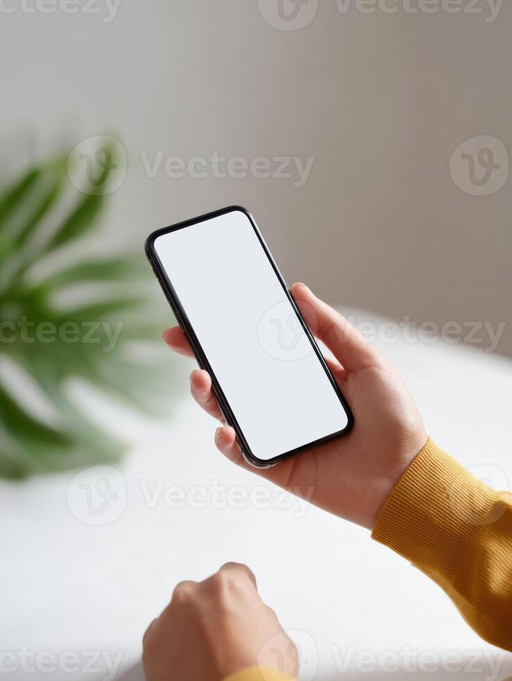 Close up of hand holding modern smartphone with blank screen. calm person browsing an app on mobile device, showing technology in minimalist workspace Pro Photo