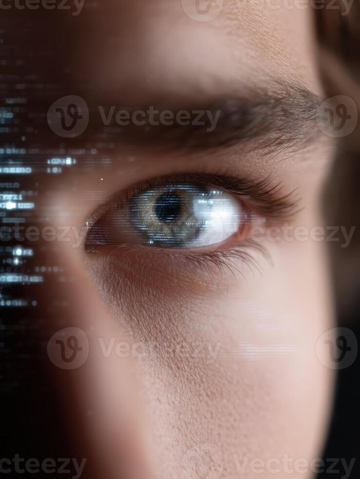 Intense close up of man eye reflecting complex digital data. futuristic concept of technology, artificial intelligence, cyborg, and virtual reality innovation Pro Photo