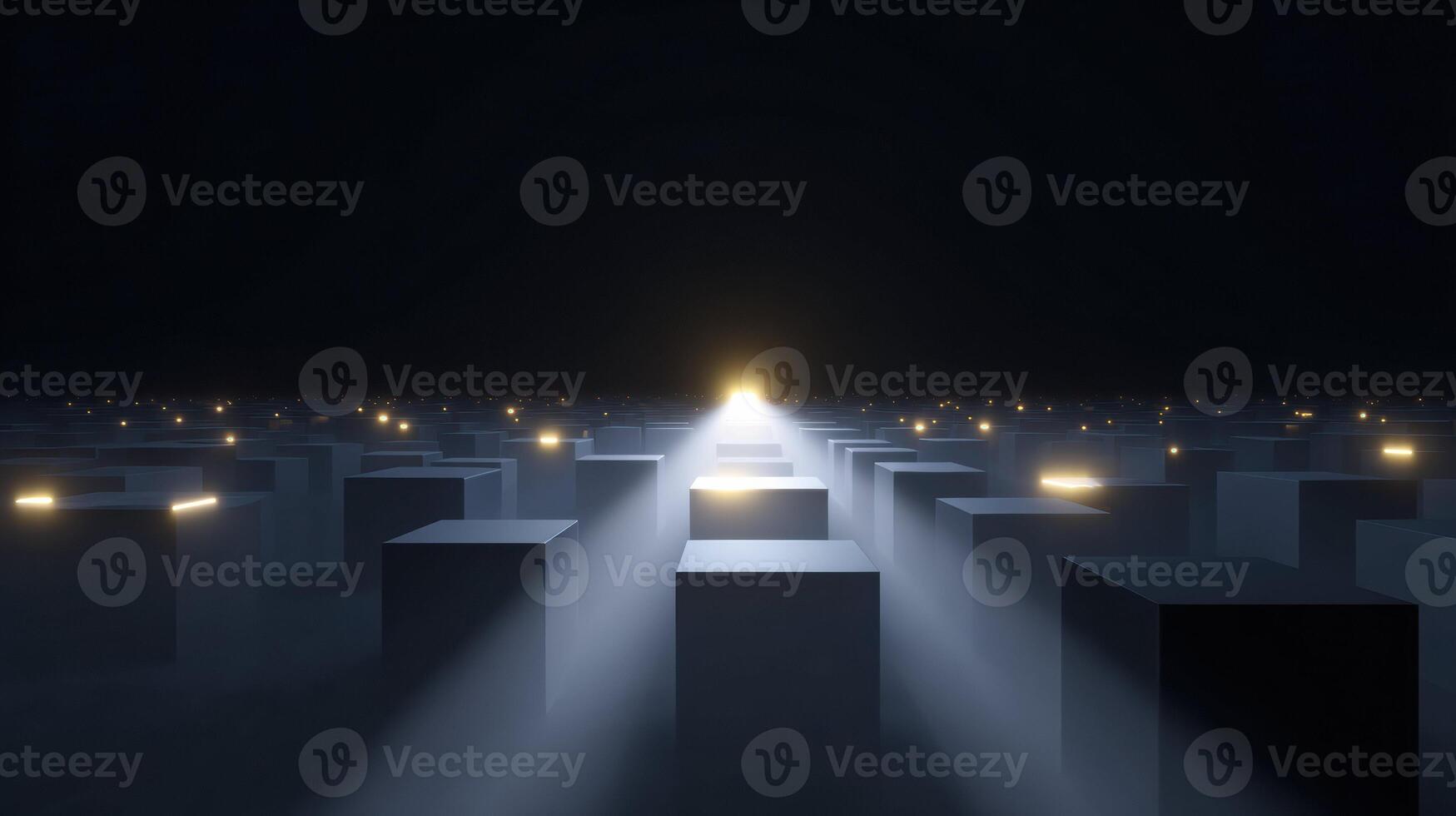 Abstract futuristic background with dark cube pattern creating mysterious perspective. single bright light casts long dramatic shadow, symbolizing hopeful concept Pro Photo