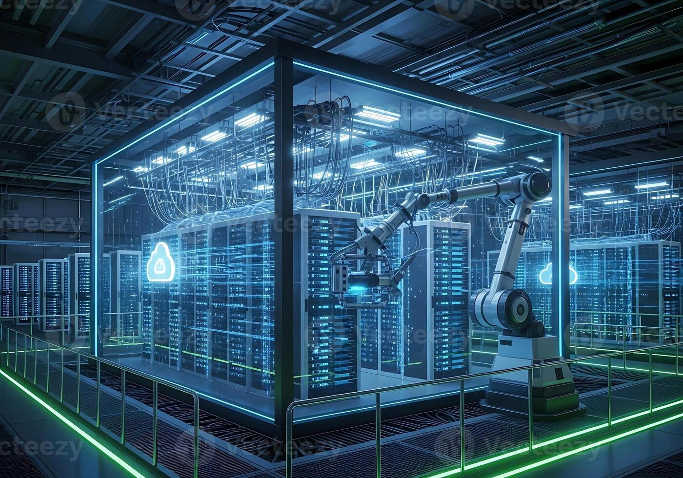 Automated Robotic Arm Servicing Advanced Server Racks in a Futuristic Data Center with Cloud Icon Pro Photo