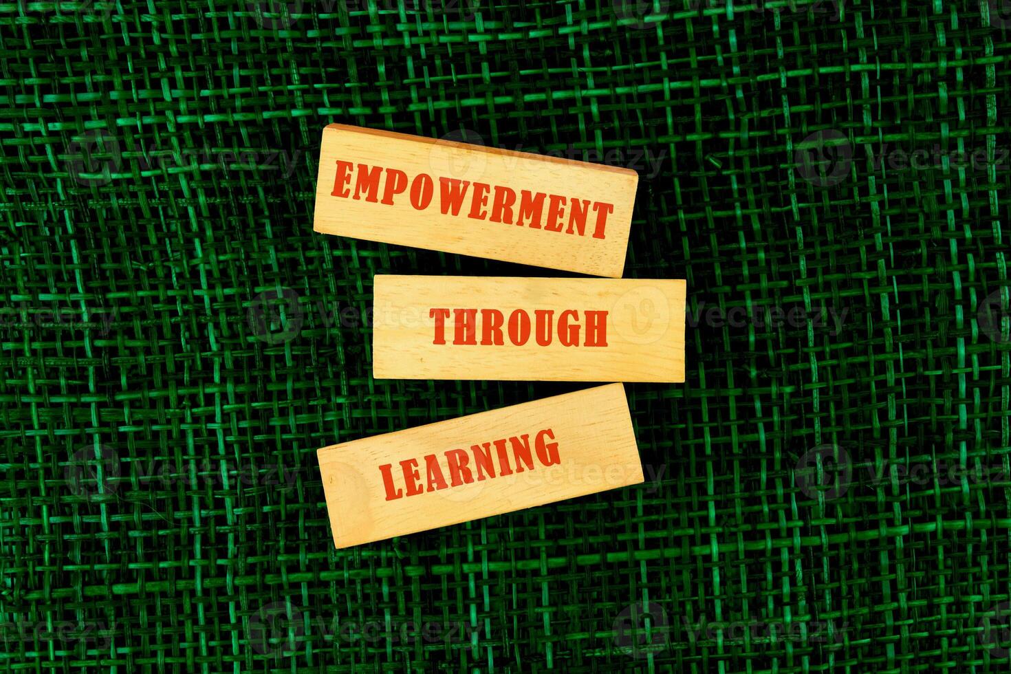 The message connect through learning. EMPOWERMENT THROUGH LEARNING made of wooden blocks on fabric background, top view Pro Photo