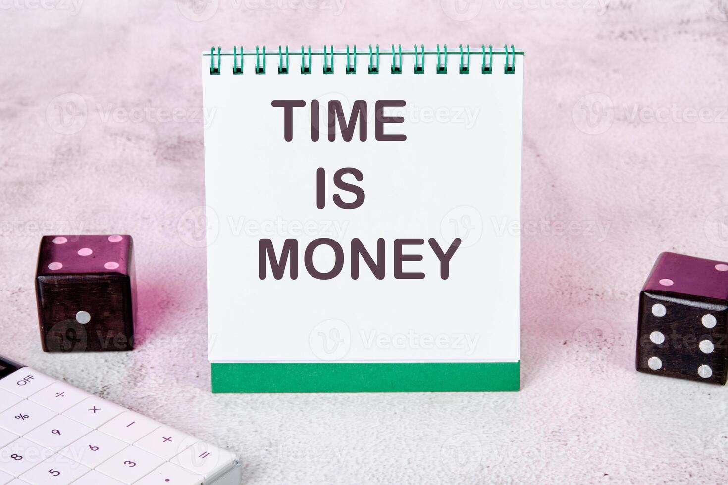 TIME IS MONEY text on a white notepad sheet next to dice on an abstract background Pro Photo
