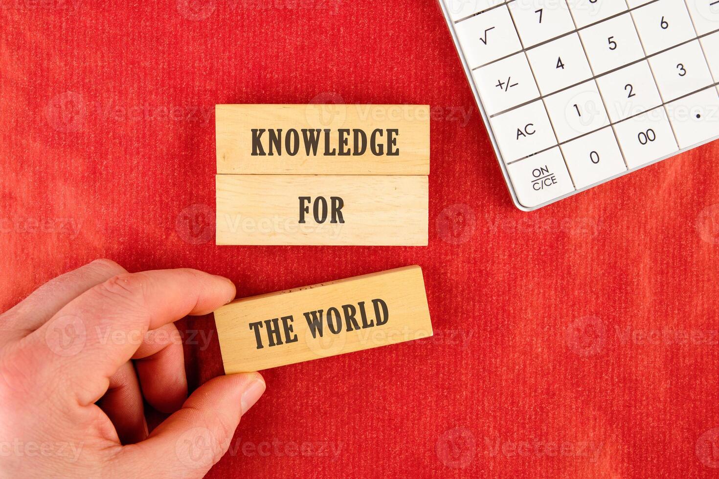 Business, success, idea, learning, planning, Education concept. KNOWLEDGE FOR THE WORLD assembled from blocks in a composition with part of a white calculator and a hand, top view Pro Photo