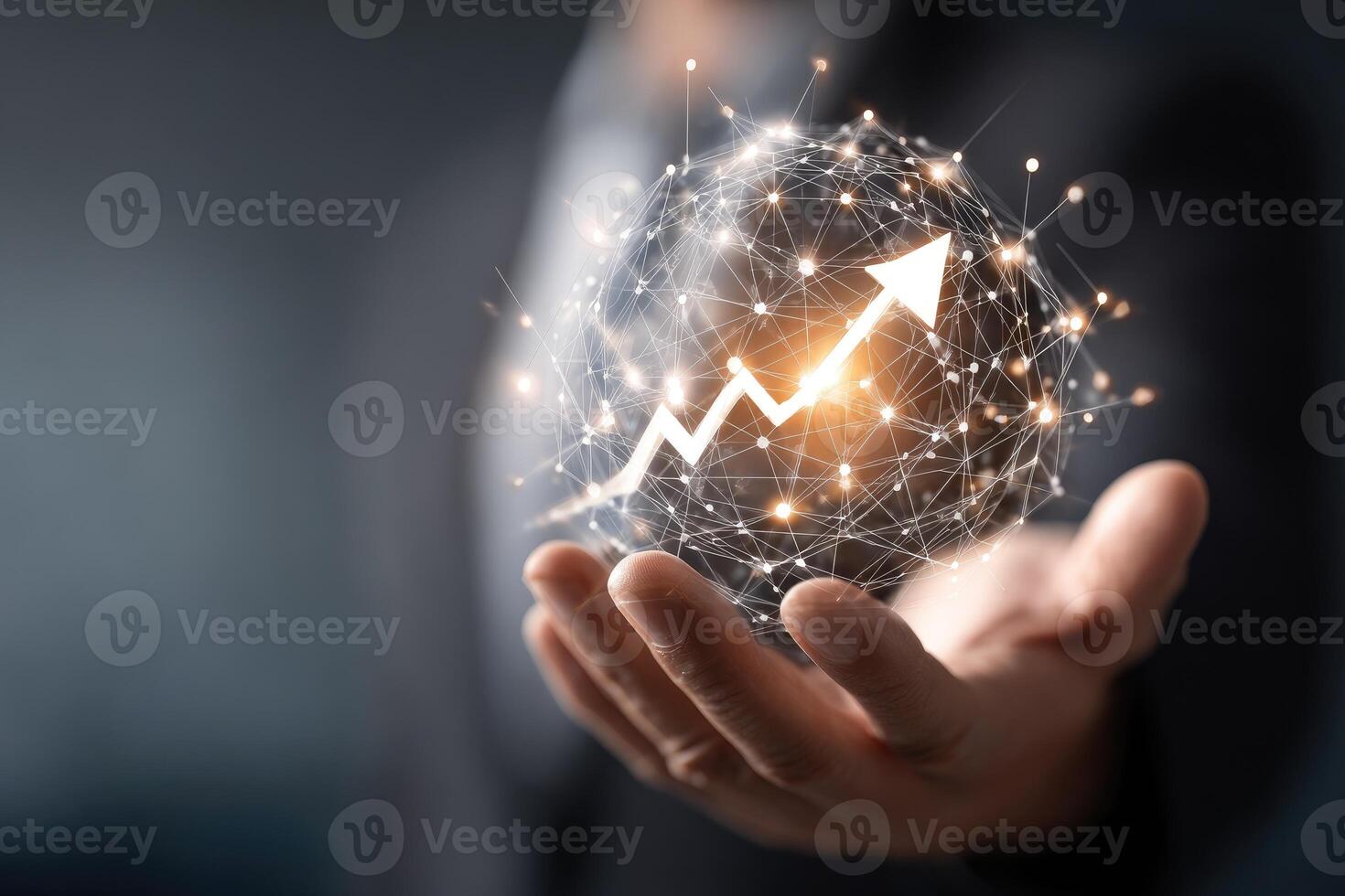 Businessman holding a glowing globe with a rising graph and network connection Pro Photo