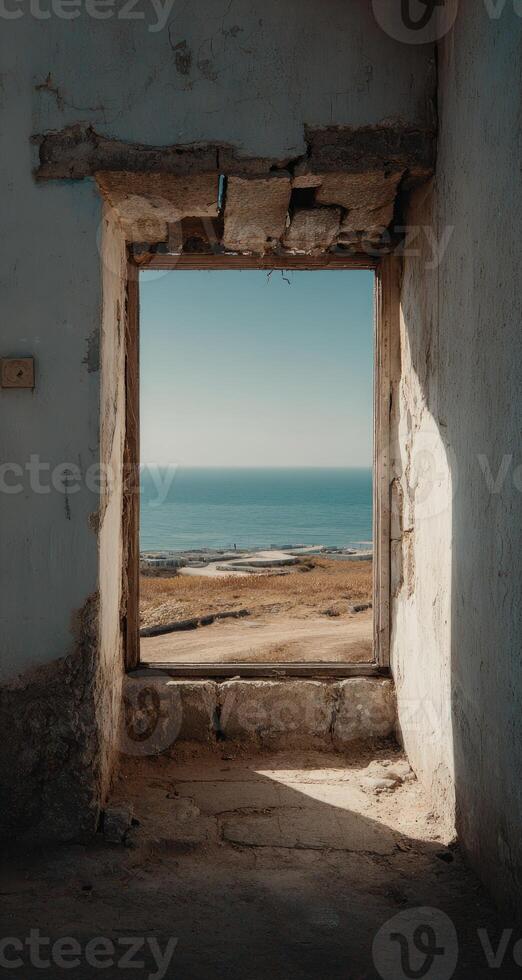 A window in an old building with the ocean view Pro Photo