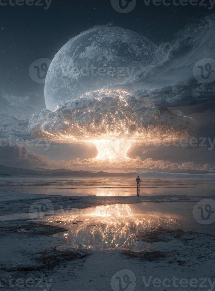 A man standing in front of an exploding mushroom cloud Pro Photo