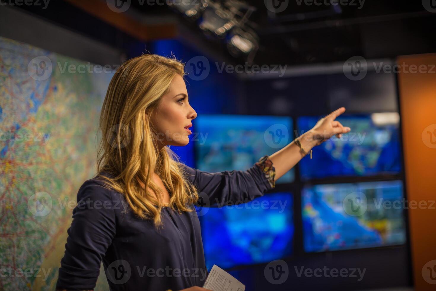 A weather reporter stands in a modern studio pointing at climate maps displayed on large screens while explaining the forecast to viewers. The atmosphere is professional and engaging Pro Photo