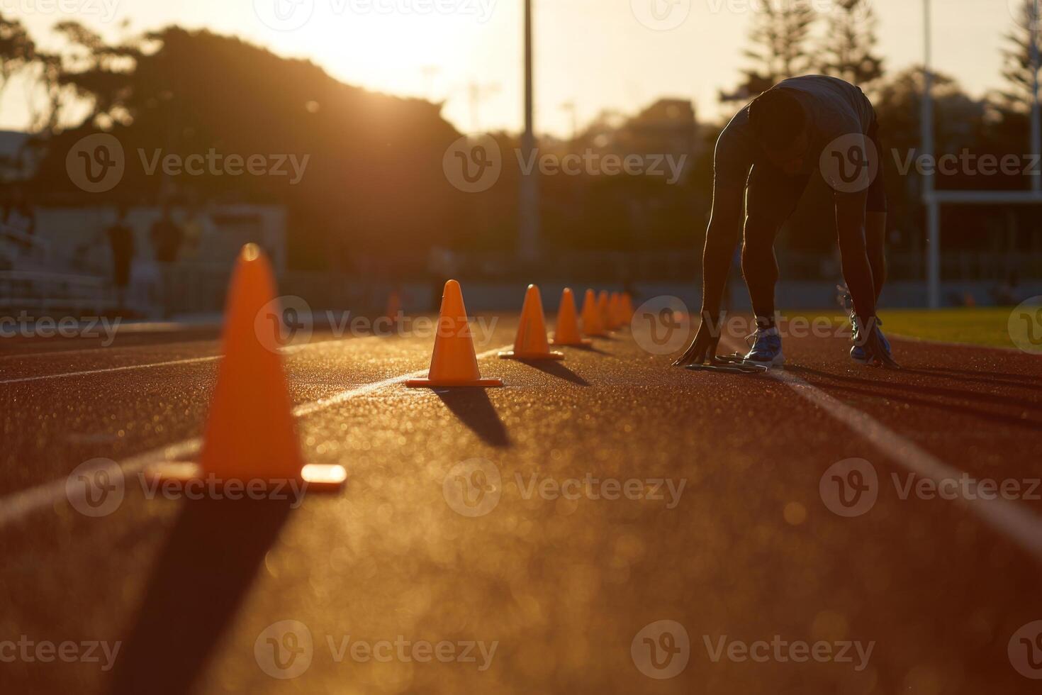 A sprinter sets up in starting position on an outdoor track as the sun sets in the background. Orange cones mark the running lanes, creating a dynamic atmosphere for training Pro Photo