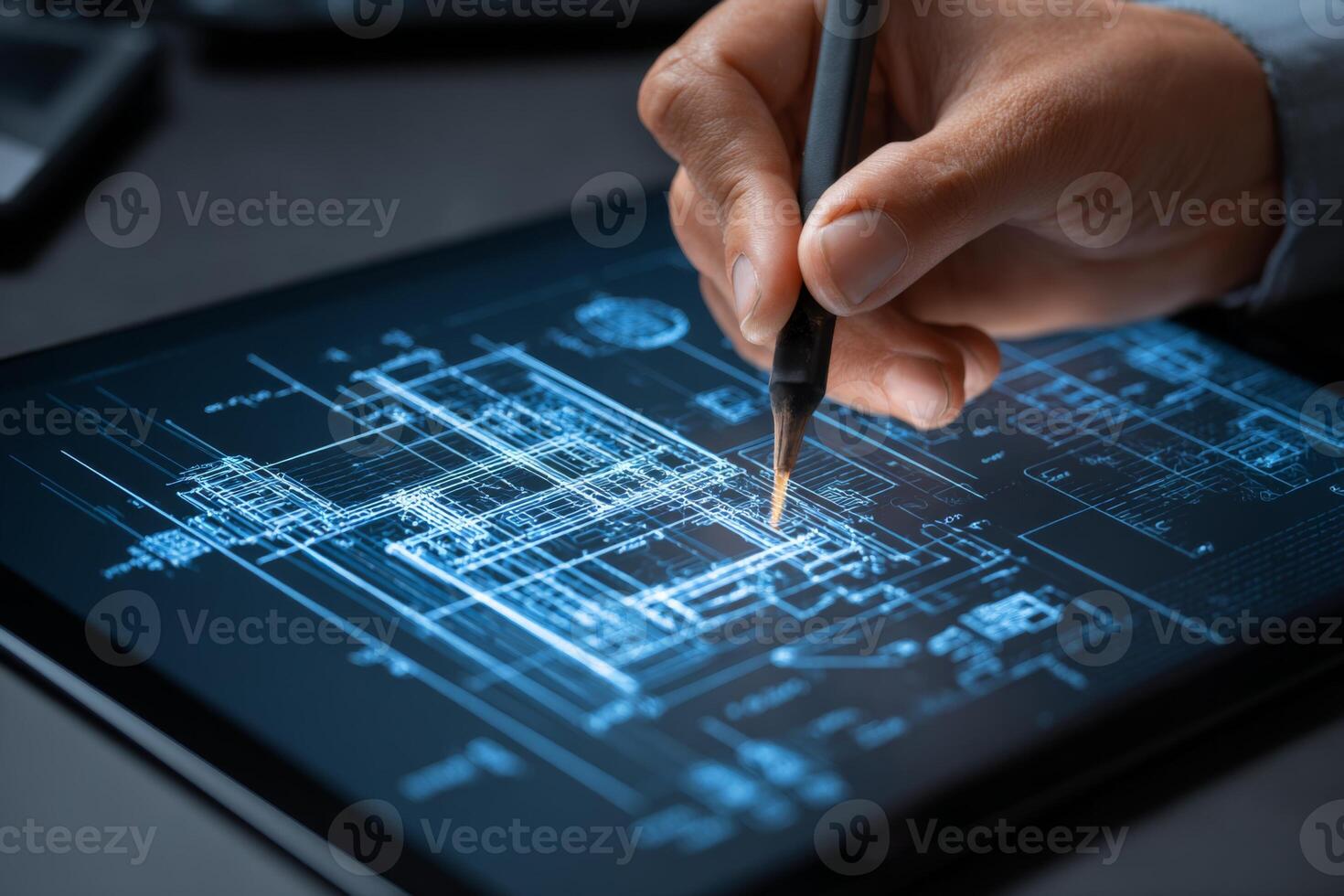A person uses a stylus to create detailed architectural plans on a digital tablet. This modern workspace features a sleek design with technological tools Pro Photo