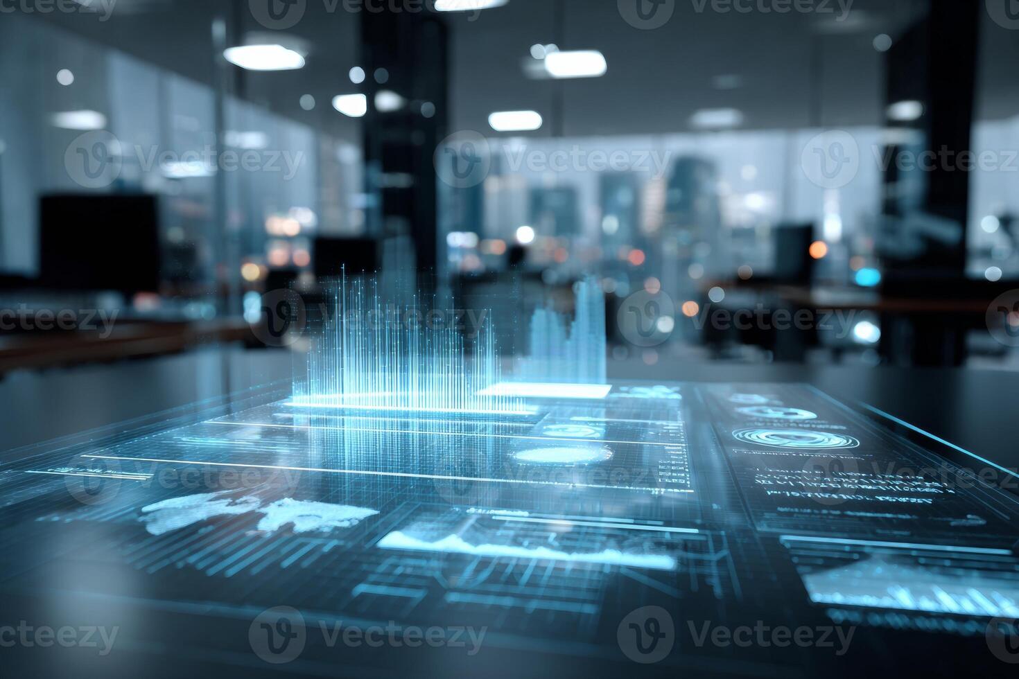 In a modern corporate office, a futuristic holographic interface projects three dimensional data and charts onto a table, creating an engaging workspace atmosphere Pro Photo