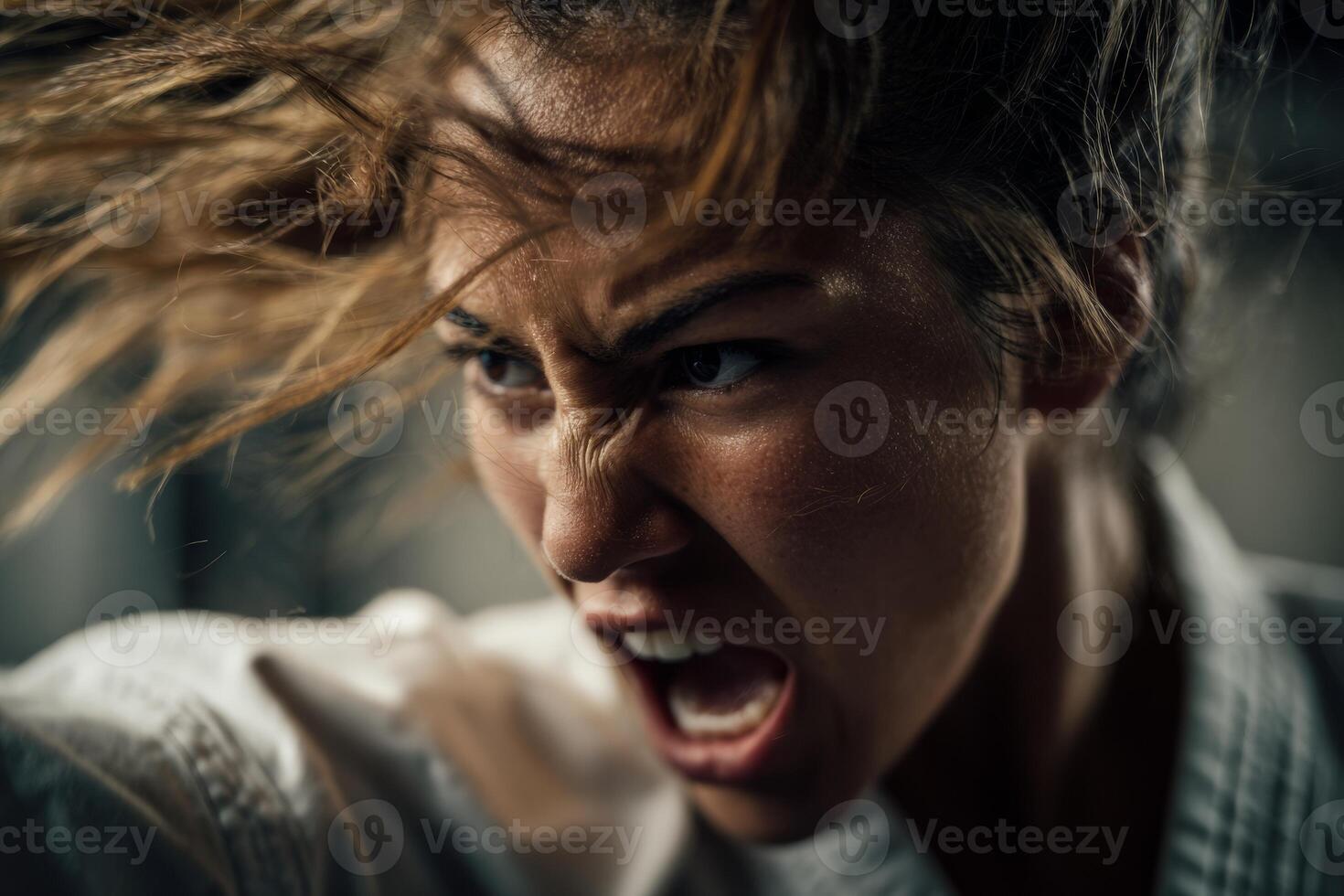 A martial artist demonstrates fierce determination and strength during a karate training session, expressing intense focus while executing a powerful technique Pro Photo