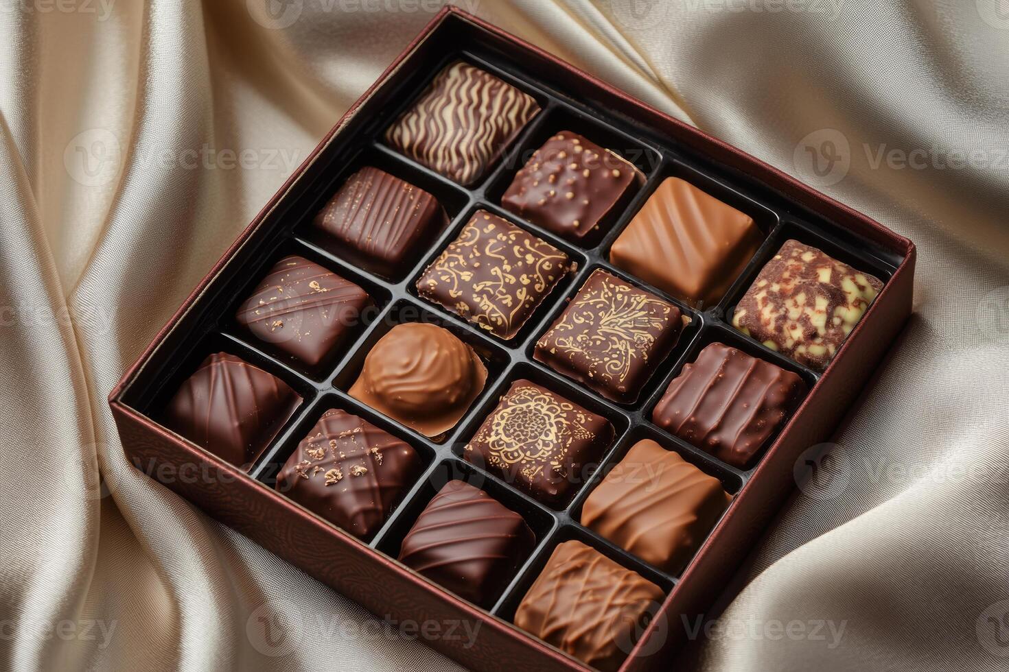 Delicious assorted chocolates with unique patterns arranged in a neat box create an inviting display on luxurious silk fabric. The elegant backdrop enhances the visual appeal Pro Photo
