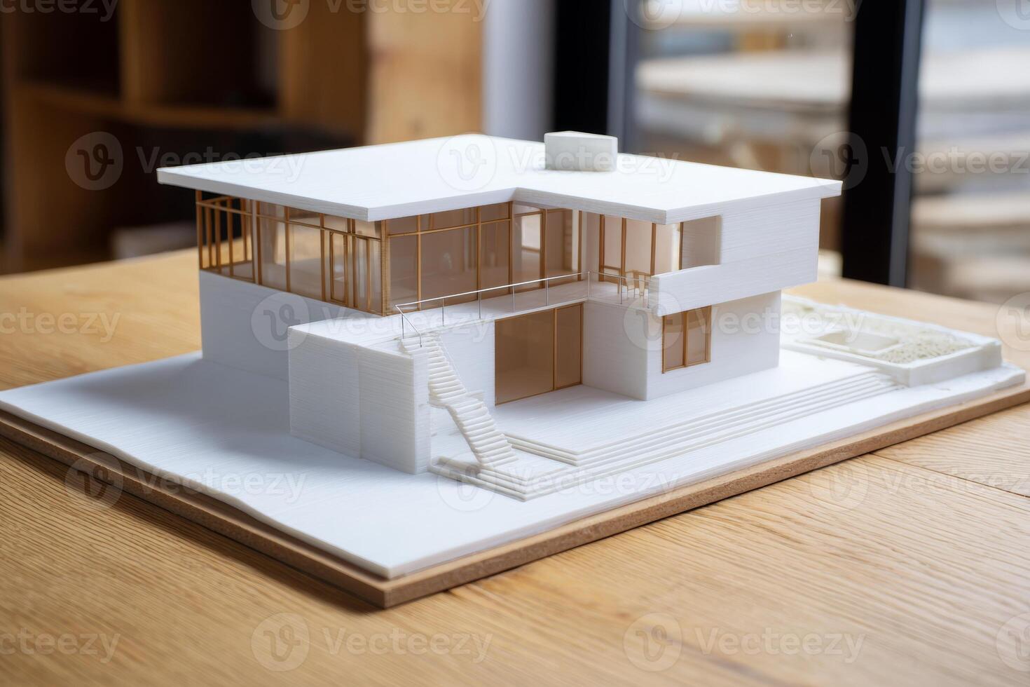 This 3D printed model showcases a modern house design with sleek lines and large windows. It is situated on a wooden table, highlighting its intricate details and craftsmanship Pro Photo