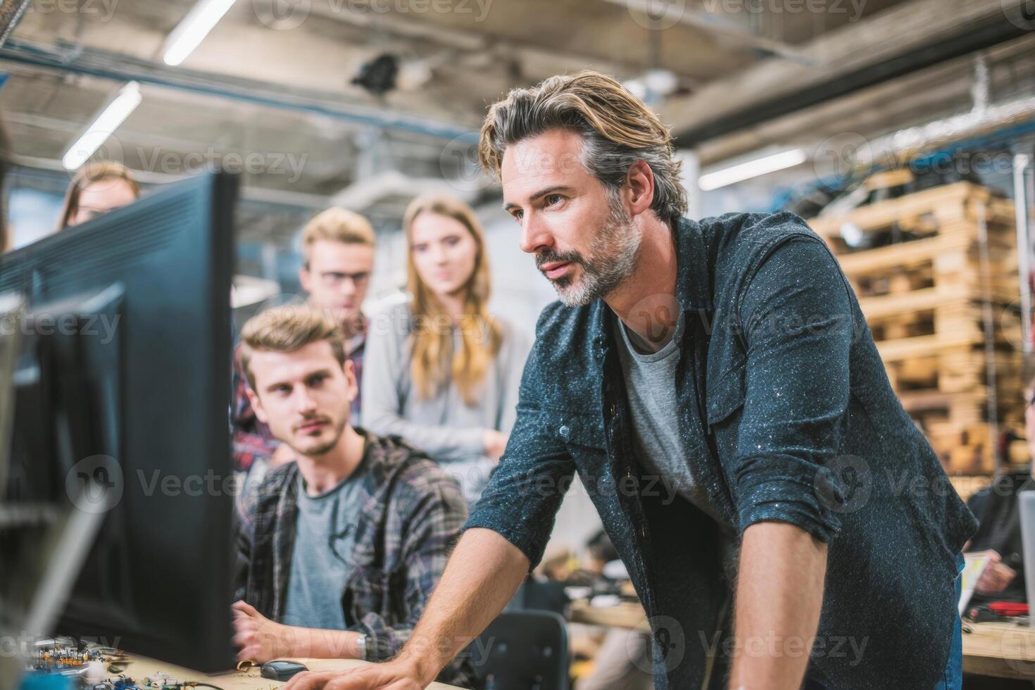 A mentor offers guidance to a startup team in a garage setting, actively assisting them with technical challenges while fostering a collaborative environment. Team members are engaged and attentive Pro Photo