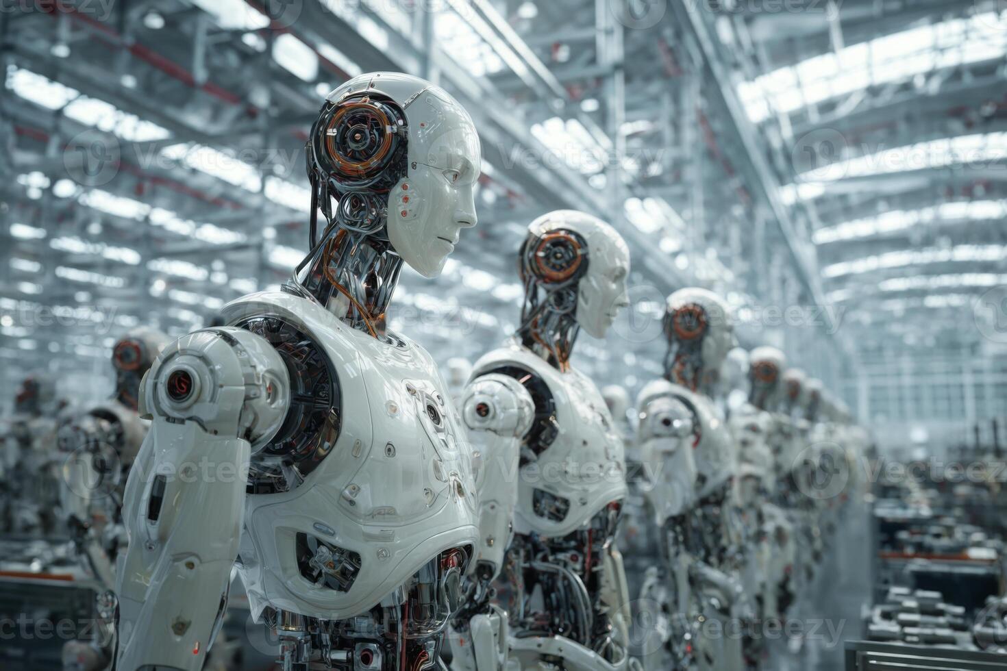 A row of humanoid robots stands in a high-tech manufacturing facility, featuring intricate designs and visible mechanical components. Bright lights illuminate the space Pro Photo